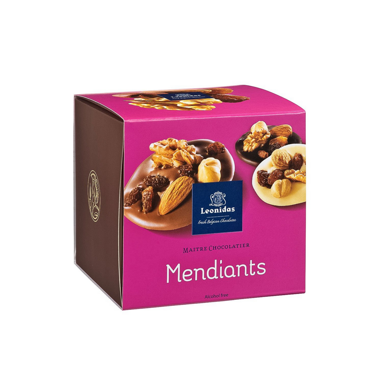 Delight in the rich flavours of our Mendiants, elegantly presented in a sleek cube-shaped box. Inside, you'll find an assortment of smooth milk, white, and dark chocolate discs, each topped with a delightful mix of dried fruits and crunchy nuts, including hazelnuts, pecans, almonds, and walnuts.